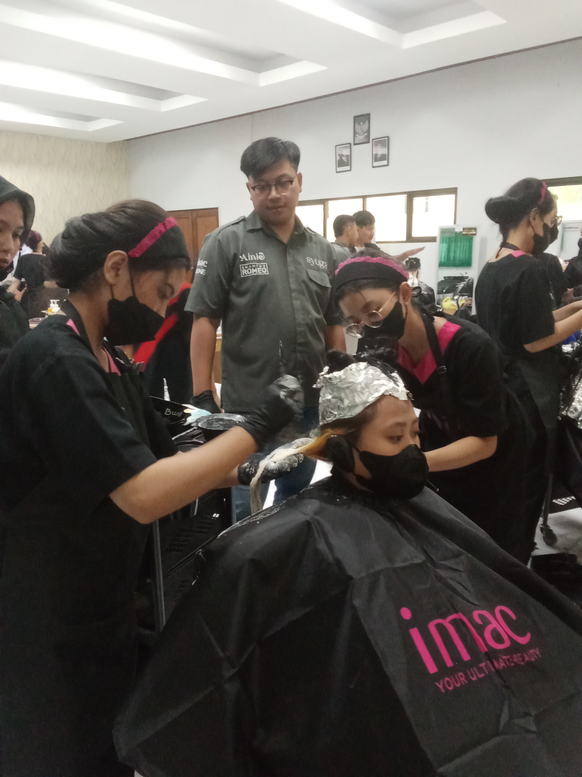 Setelah sesi teori, kegiatan dilanjutkan dengan praktek langsung. Para peserta dibagi dalam beberapa kelompok kecil dan diberi kesempatan untuk mempraktikkan teknik pewarnaan rambut menggunakan produk iMAC Haircolour. Pendampingan dilakukan langsung oleh tim teknis dari PT. Sekawan Cosmetic Wasantara yang memberikan arahan terkait cara mencampur bahan, mengatur timing pewarnaan, serta teknik aplikasi untuk hasil maksimal.